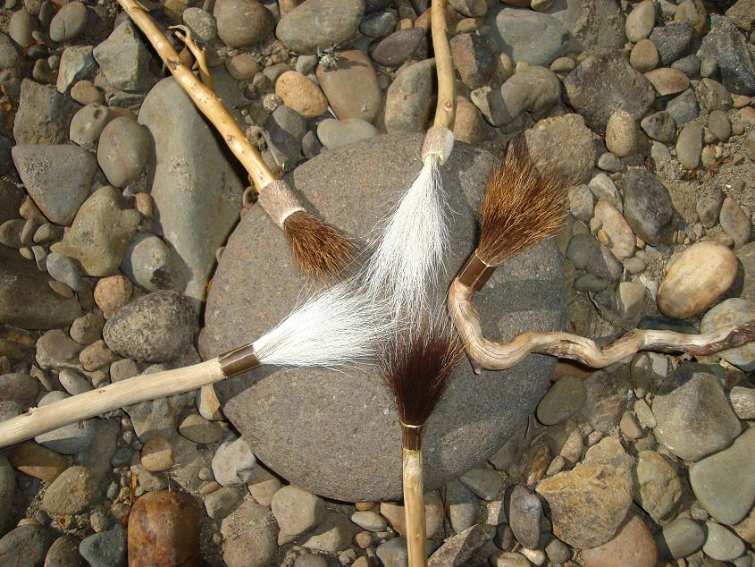 These paintbrushes/ticklers are made from 100% driftwood with the brush made from deer fur. They have brass ferrules, some have deer hide ferrules. They work well with water color and acrylic paints and on your partner's neck. They have been tried and tested. Due to the fact that they are glued they would not serve the artist well for oils.